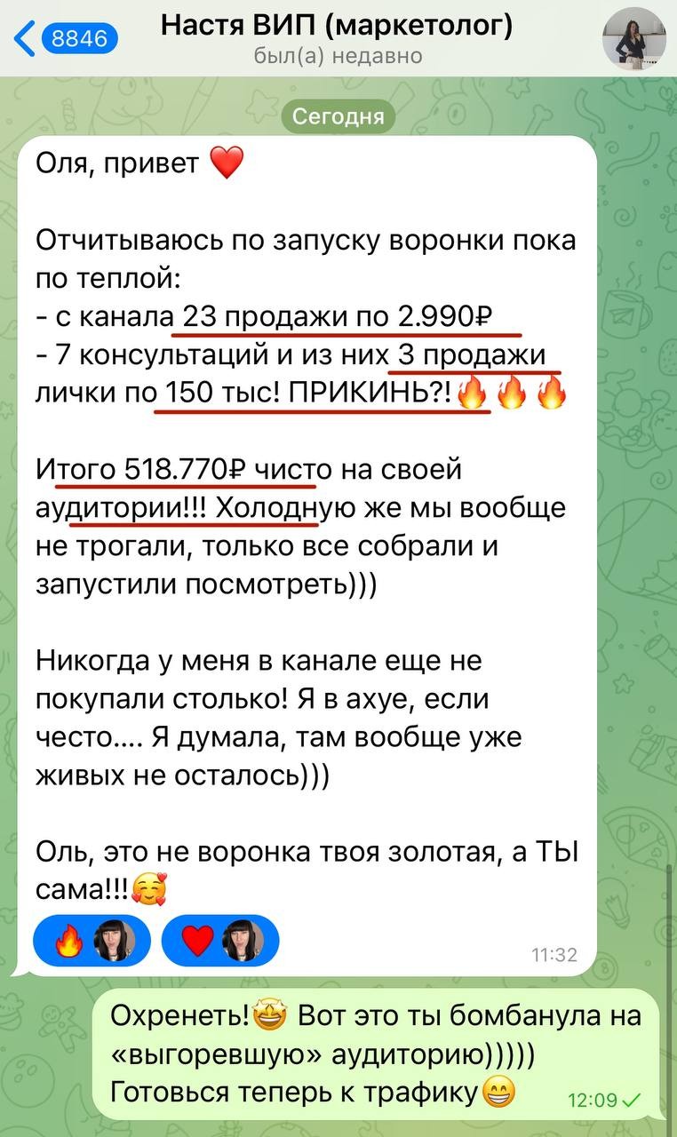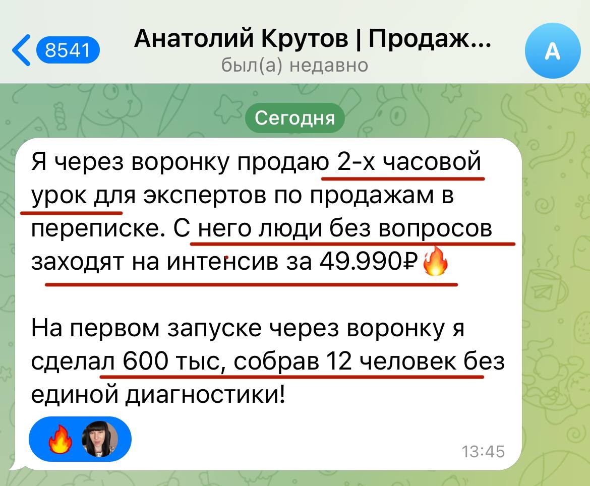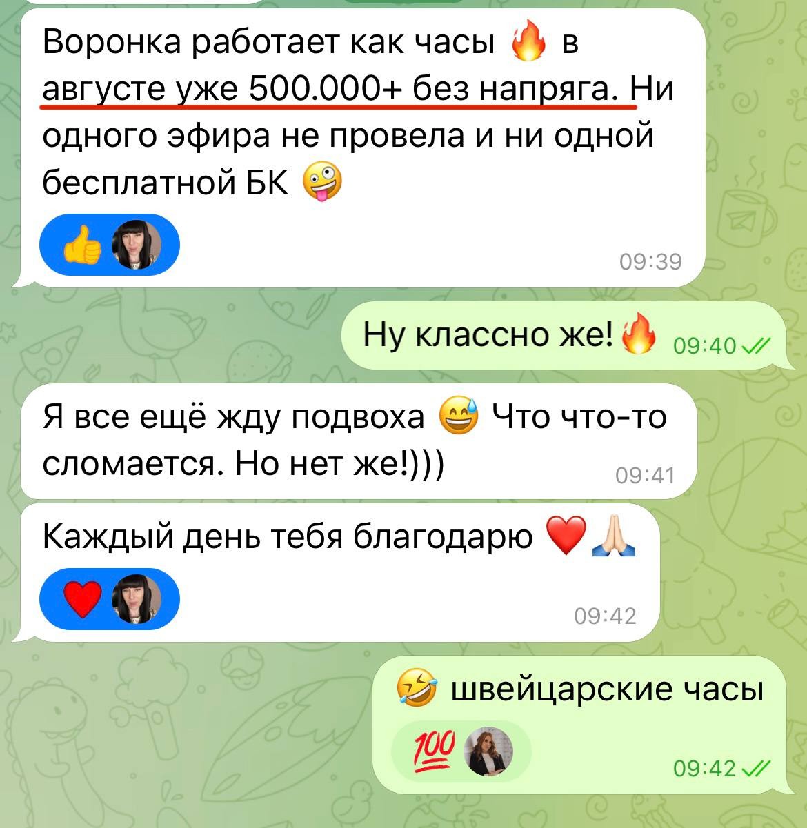 При этом люди даже не понимают, что вовлечены в процесс продаж. Настолько мягко и нативно происходит колоссальная работа, которую вы привыкли взваливать на себя: писать прогревы, проводить бесплатные консультации, монтировать бесконечные рилс....